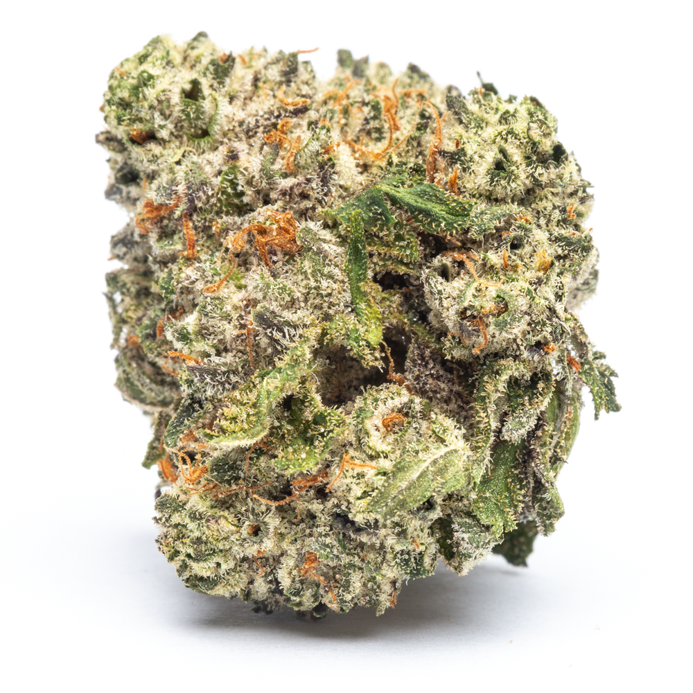 The buds of Bubba Fett very pretty, with a spade-like shape and a light mint-green hue. Bright orange hairs weave through a thick layer of frosty trichomes creating an enticing, resinous texture.
