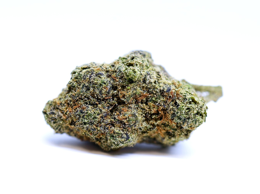 Compact, light green buds with blue-ish purple flecks and lots of trichome coverage.