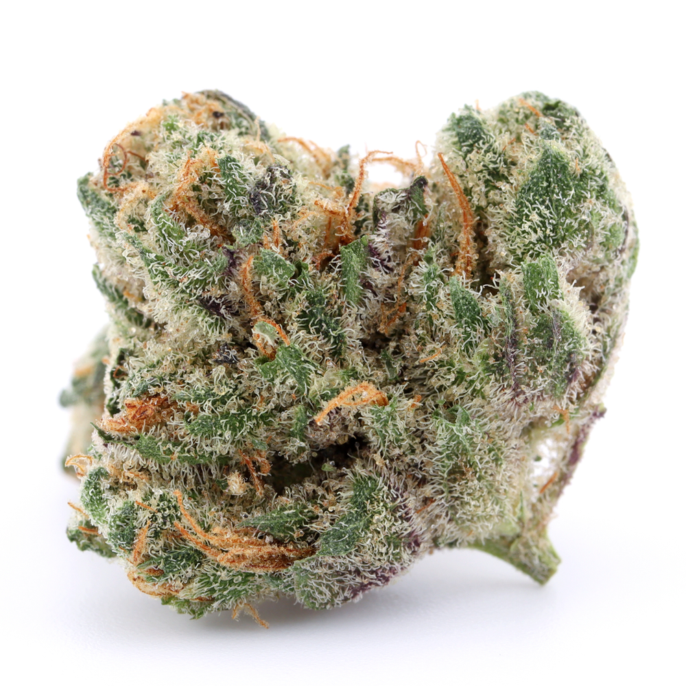 Hues of purple and vibrant greens color these buds along with bright orange pistils and a frosty layer of white trichomes.