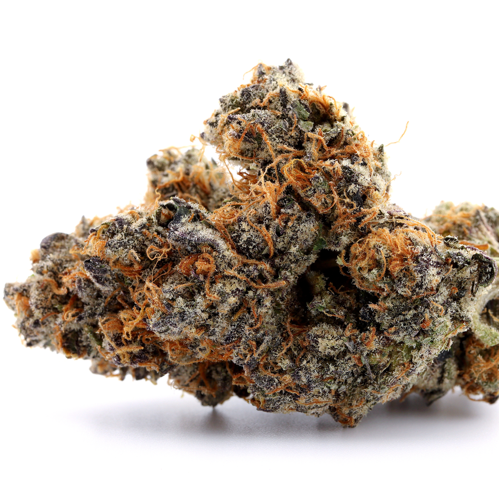 Covered in frosty white trichomes, these beautiful primarily purple nugs have more orange pistils than I could count.