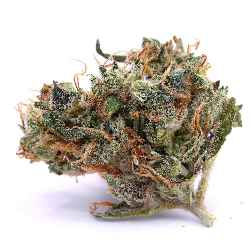 Fresh and fluffy buds that are mainly green with some darker purplish coloration here and there. Also note that it’s hand-trimmed and has extra long pistils with a good amount of trichome coverage.