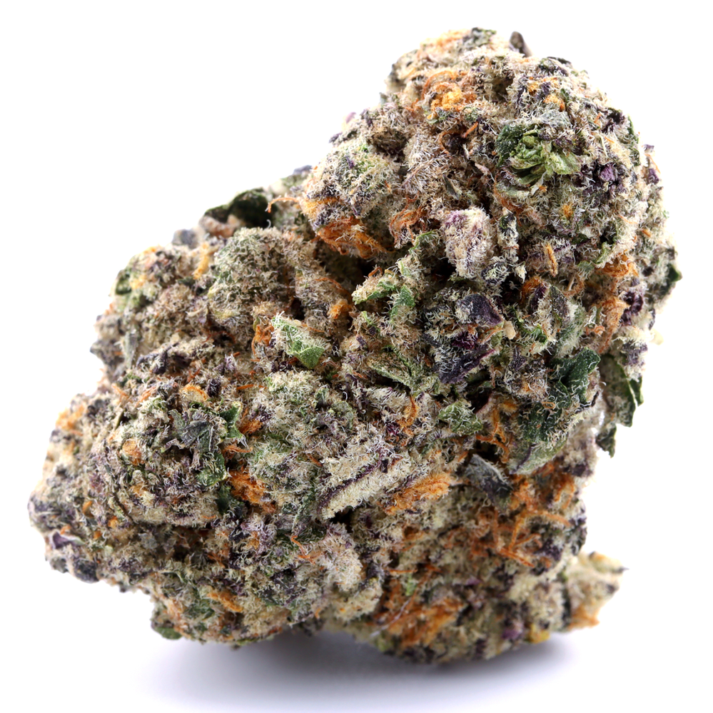 The buds of Real High are chunky and well-cured, showcasing a beautiful mix of dark green leaves with patches of purple. The orange pistils are vibrant and the trichomes are plentiful.