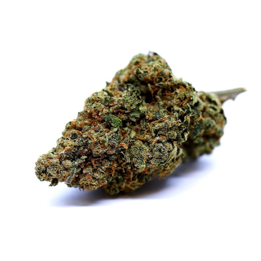 These darker green and spear-shaped buds are coated with starry and white trichomes and have reddish-brown pistils.